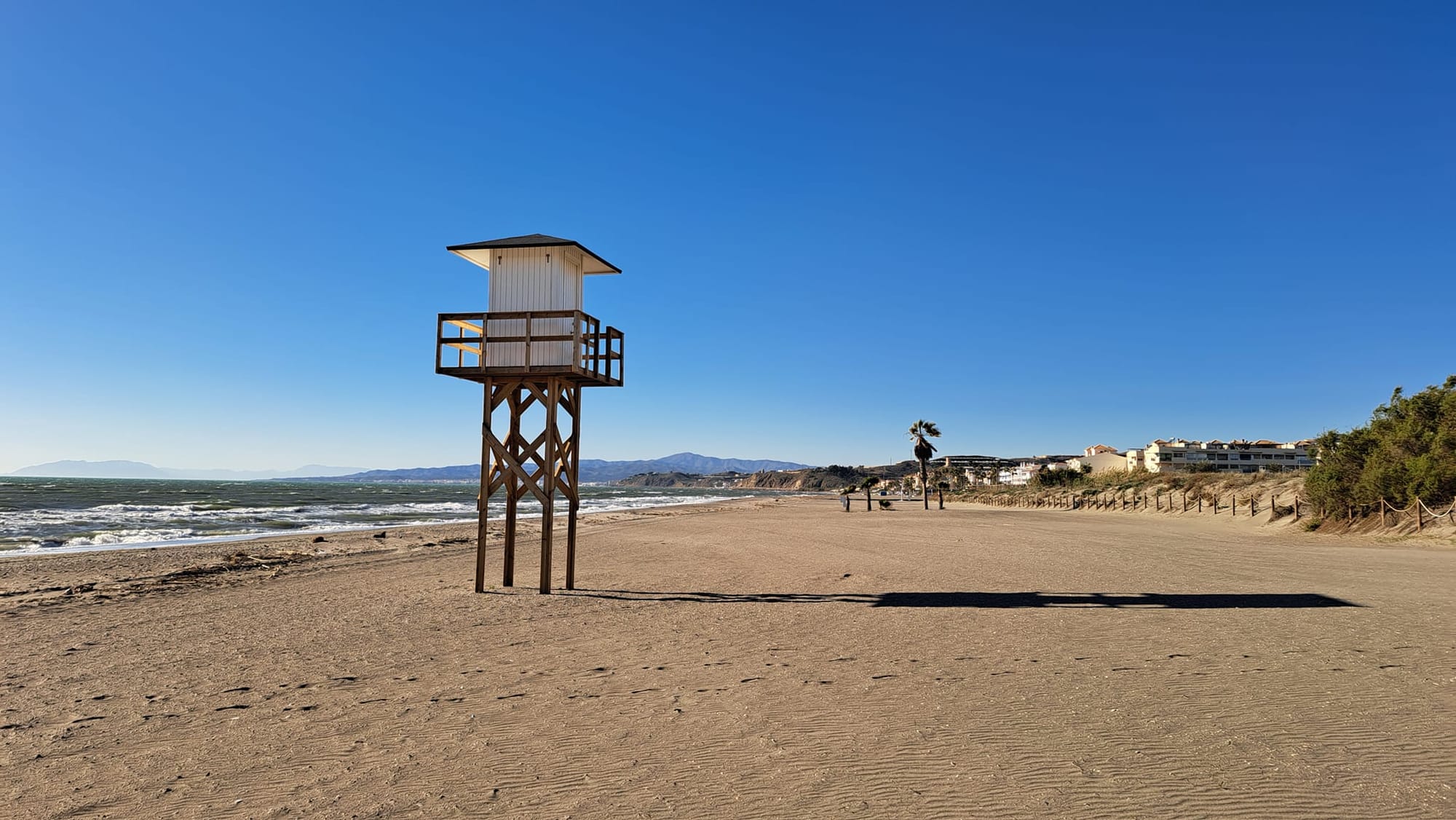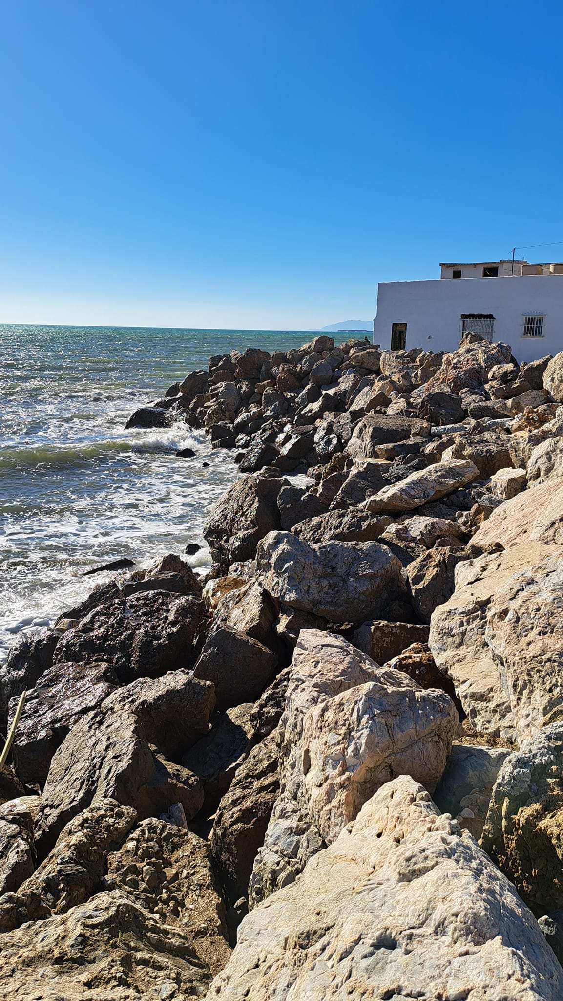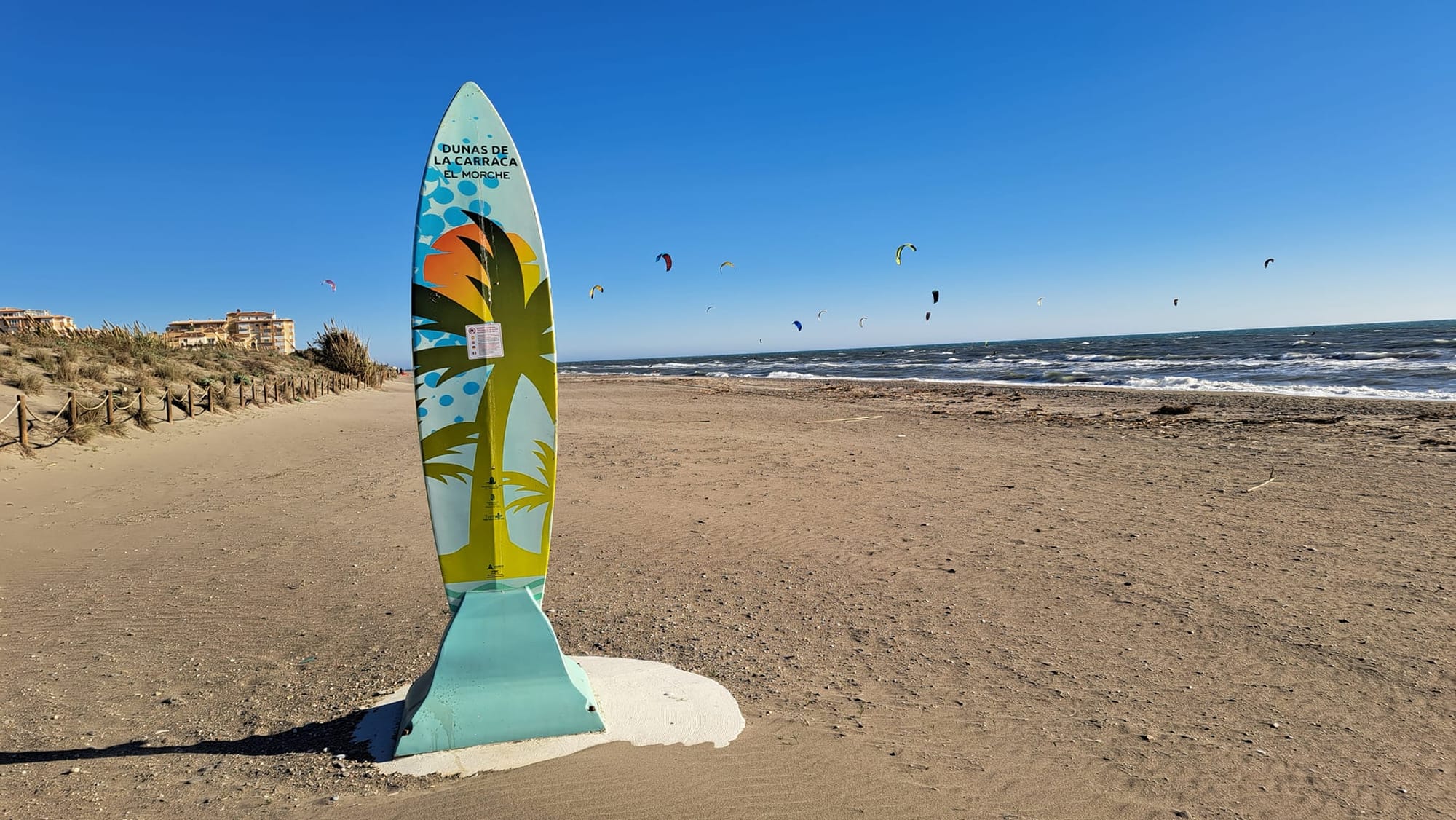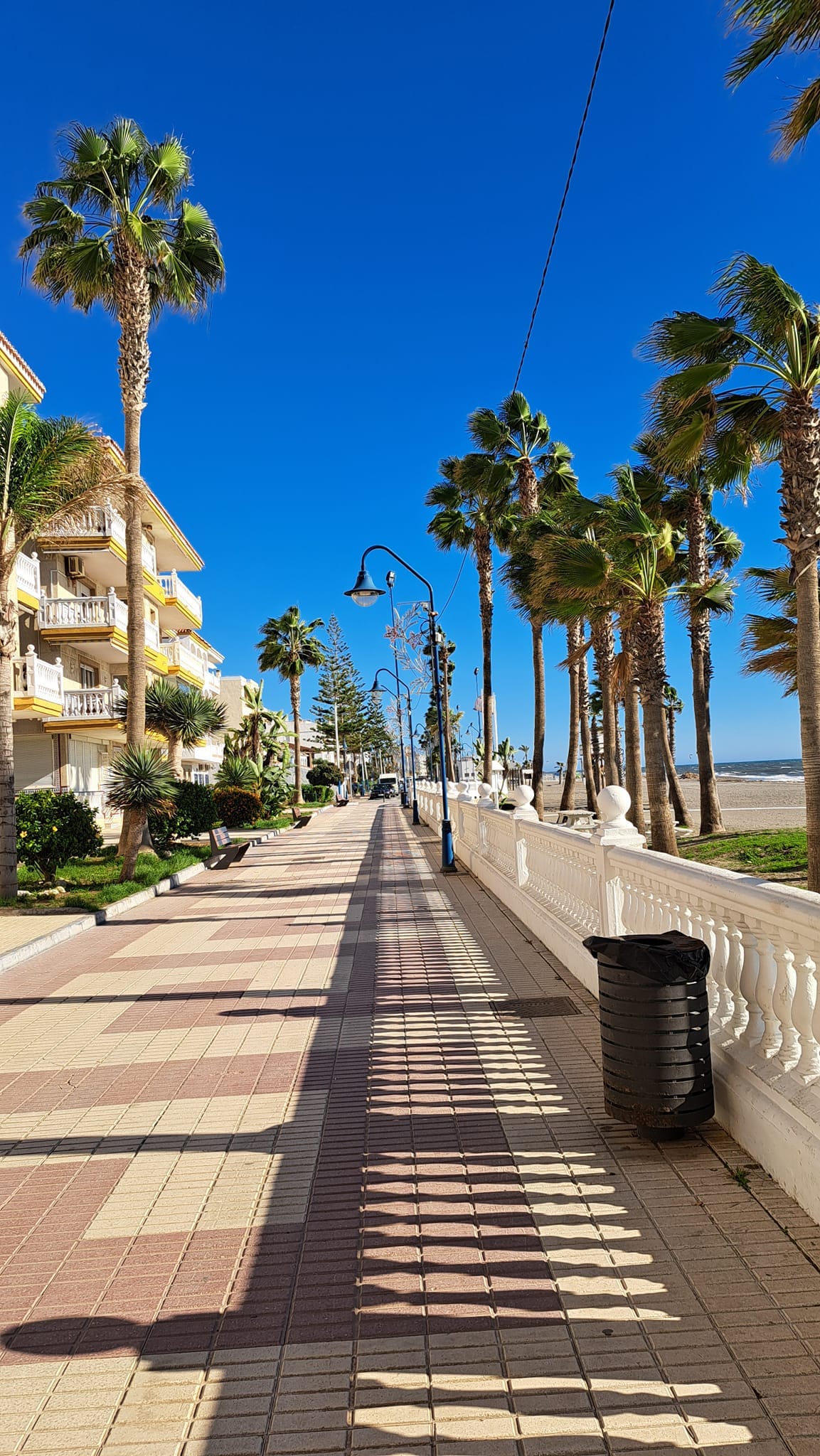 Ondertussen was het 14.30 u gepasseerd, te vroeg om terug te keren en te laat om nog naar Frigiliana te rijden. Maar geen zorgen, de weg er naartoe is bezaaid met kleinere dorpen en er is altijd wel iets te zien. Ik passeerde Algorobbo costa, Mezquitilla waar ik wou stoppen om een hele mooie boom te fotograferen, maar waar ik niet direct plaats vond om te parkeren. De wind was harder gaan waaien en in de verte zag ik de windsurfers op het strand van El Morche. Hier ken ik wel een goede parking waar meestal plaats is. Vol verwachting liep ik ernaar toe en niet voor niks. Het was een mooi schouwspel en even had ik toch spijt dat ik mijn goede camera niet mee had genomen.
