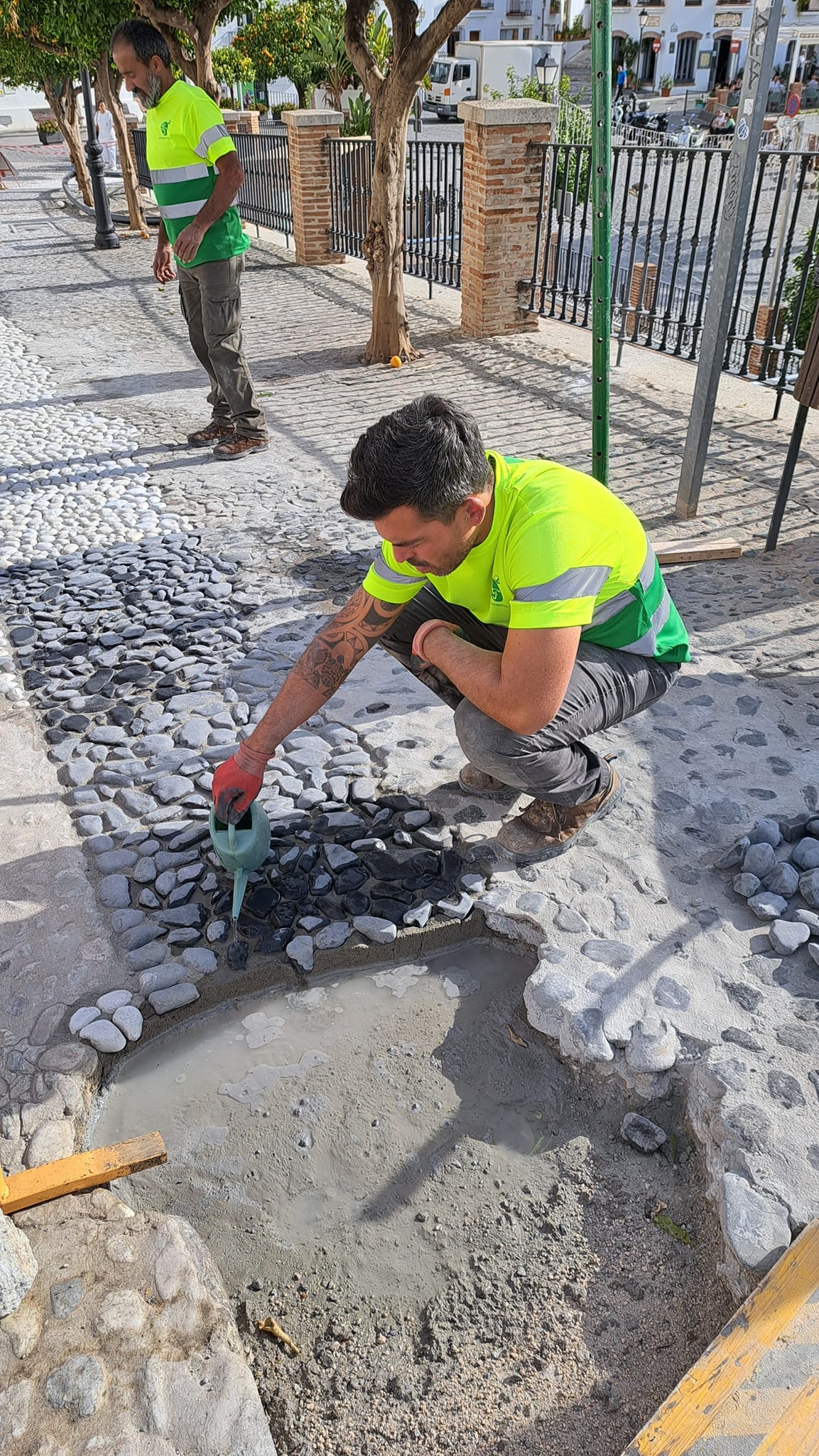 Wie Frigiliana al heeft bezocht, weet al dat het dorp bestaat uit 2 delen. Het oude gedeelte met de hele smalle, steile straatjes gevuld met honderden planten en bloemen en het nieuwere gedeelte met bredere straten, maar evenzeer versierd met planten, winkeltjes, parkjes en speeltuintjes. Beide delen, maar vooral de oude stadskern heeft straatjes die men kan bestempelen als ware kunst. We hadden trouwens een klein gelukje, want enkele werkmannen waren net een stuk aan het restaureren. We kunnen nu getuigen van het ware vakmanschap en bovenal het geduld nodig om zo’n kunstig straatje aan te leggen.
