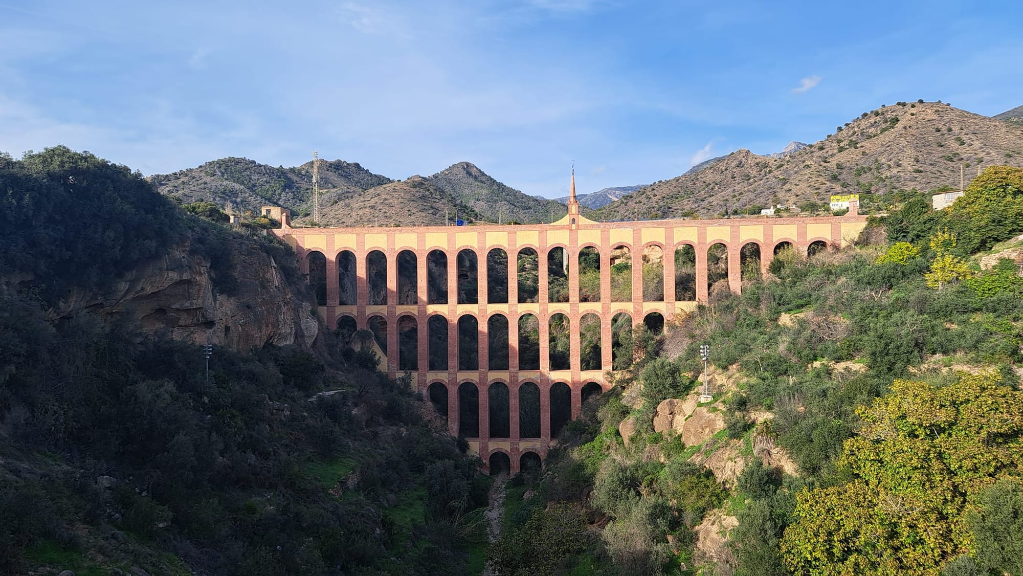 Op de terugweg stopten we nog even bij “el acueducto del Aguila” die werd gebouwd tussen 1879 en 1880 voor de wateraanvoer naar de suikerfabriek van San Joaquin. De aquaduct werd gerestaureerd in 2012 en verkeert in perfecte staat in tegenstelling tot de suikerfabriek. Zij wacht nog op een investeerder voor een toekomstige restauratie. Je vindt deze aquaduct niet ver van de grotten van Nerja.