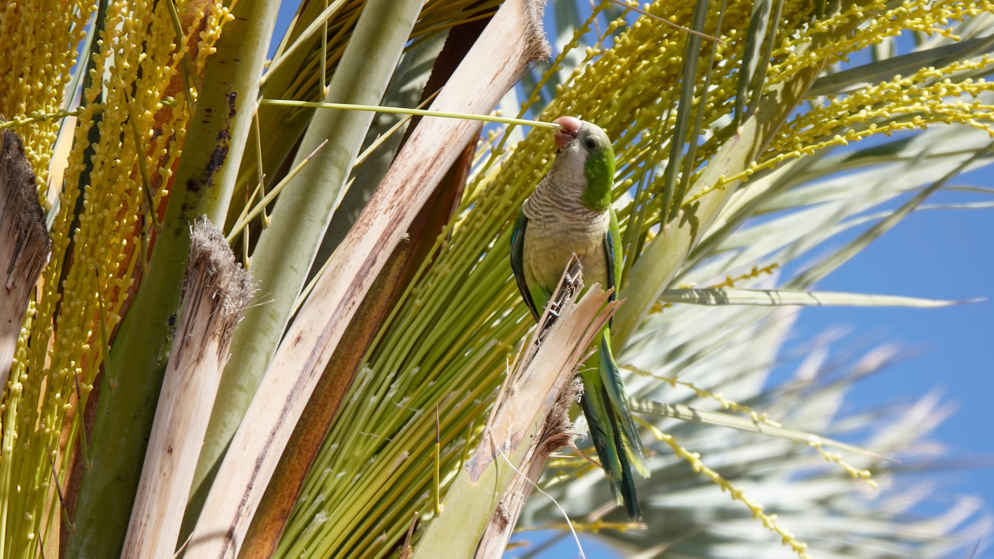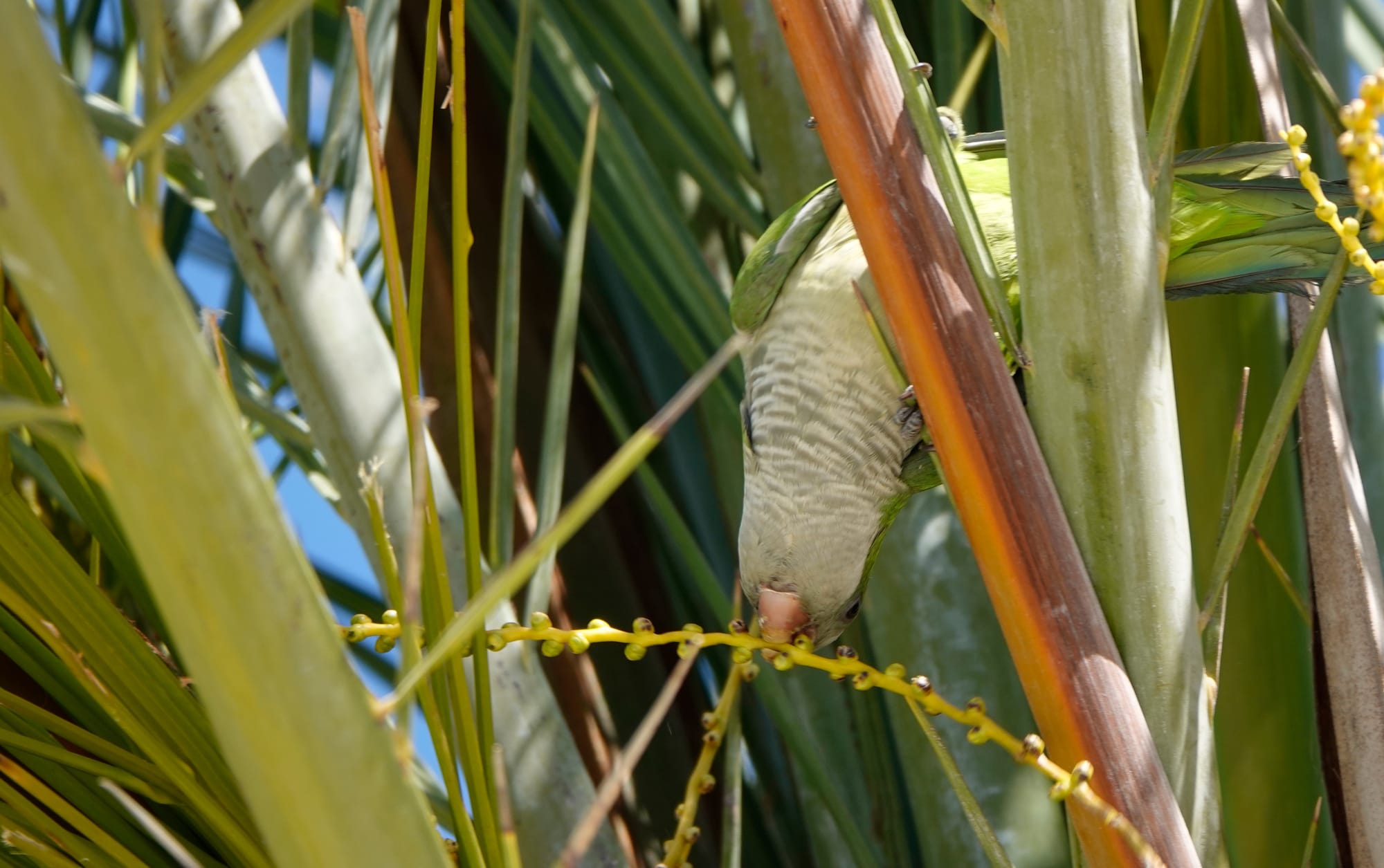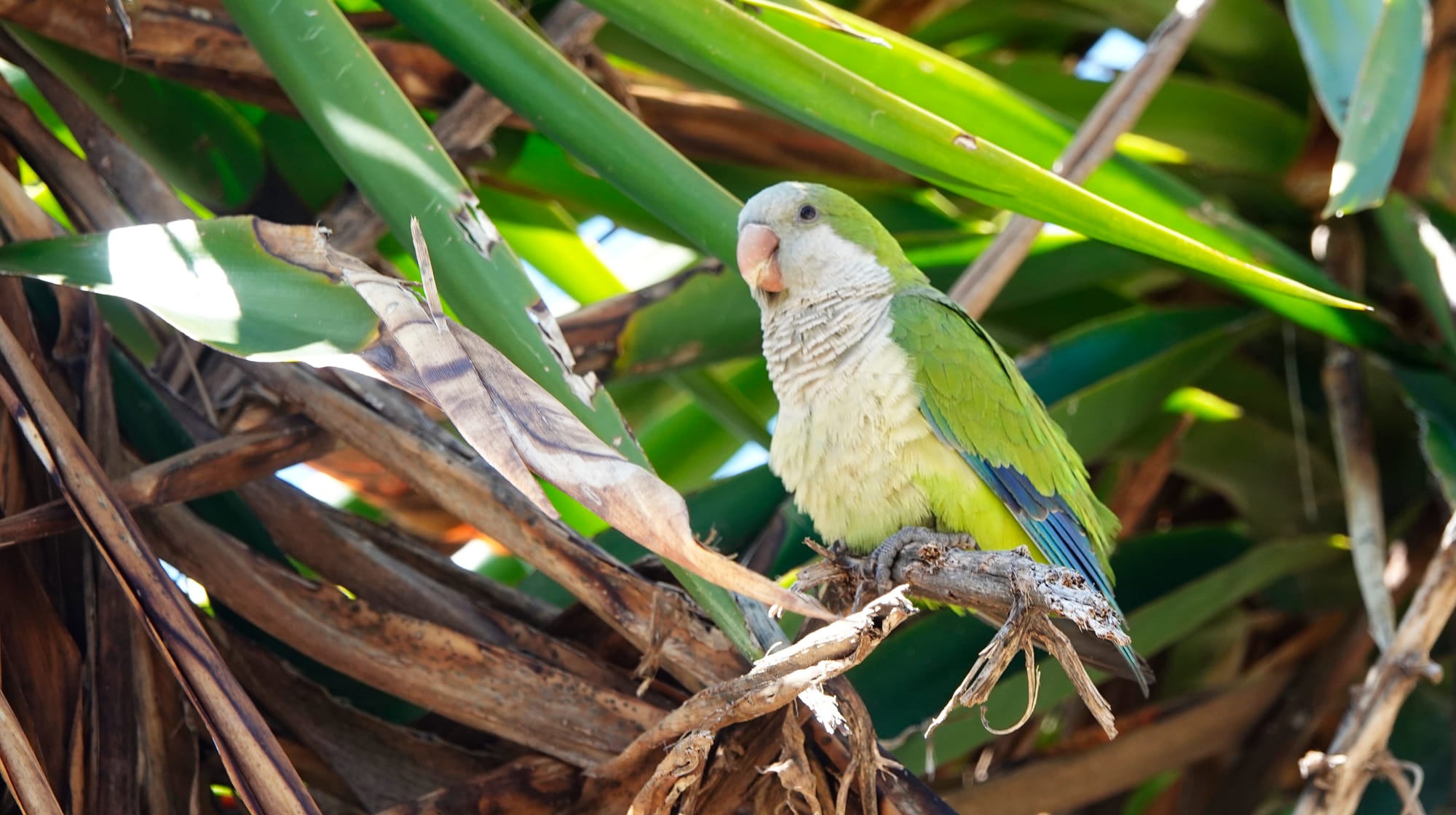 De monniksparkiet ( Myiopsitta monachus ) komt oorspronkelijk uit de subtropische gebieden van Argentinië, het zuidelijk deel van Brazilië en Zuid-Amerika en heeft zich goed aangepast aan het klimaat in Spanje. Ze leven in grote groepen en hun belangrijkste voedsel bestaat uit bladknoppen, zaden, vruchten, noten en bloesem.